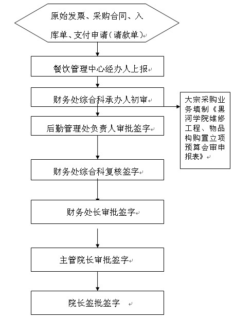 按照黑河学院餐饮财务管理制度,现金限额标准、及黑河学院餐饮管理中心核批的采购合同进行审批。