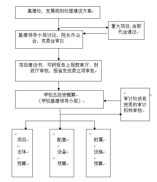 基建处依据学校发展规划提出年度拟建项目的意见,邀请校内外专家对项目建设地点、规模、功能、标准、环境影响、投资估算、资金筹措、经济效果和社会效益等充分论证,形成项目建设方案。方案提交基建工作领导小组讨论后,报校长办公会、党委会审议、研究决定。
