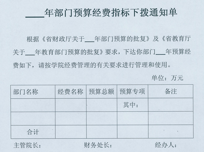 为使预算管理更加科学化、规范化、合理化,我们将全面实行预算指标管理。在财政厅下达预算批复后,财务处下发各系、中心、各部门预算经费指标通知单。如下图: