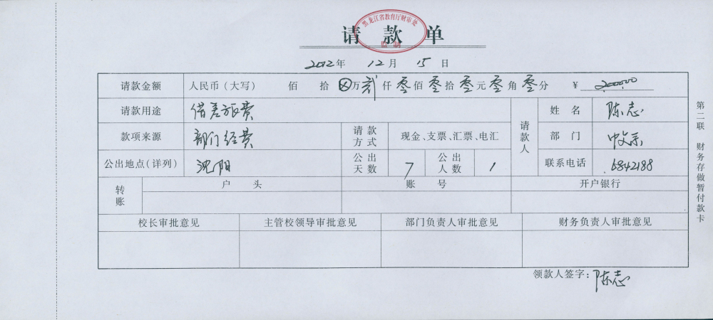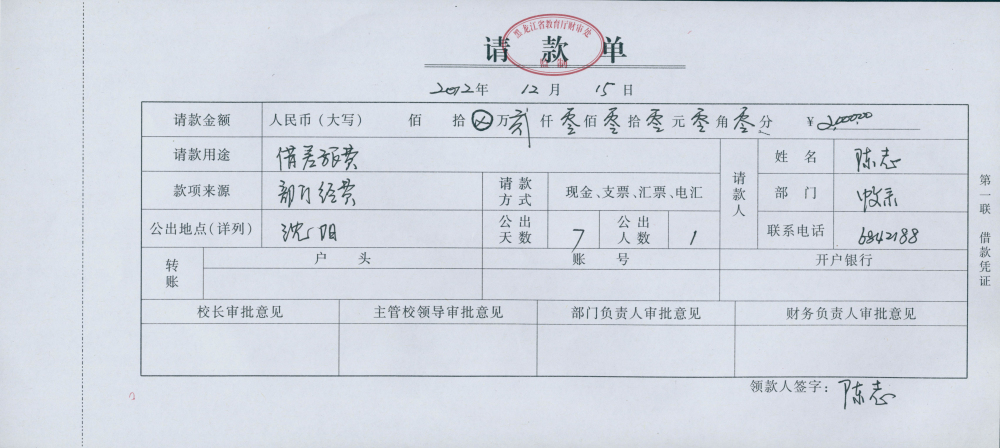 (1)申请办理借款的人员根据需要向学校财务处提交一式两联的请款单(在学校财务处领取),请款单应写明:借款原因、经费来源(填写部门经费代码号)、本次借款金额、单位或项目负责人及主管校长签字、单位或项目负责人及经办人的联系电话;