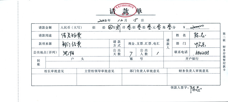 (2)教职工出省参加会议、培训等需要暂借差旅费、办公费等业务款时,请款单可以视为借款凭据。请款单一式两联,见附表