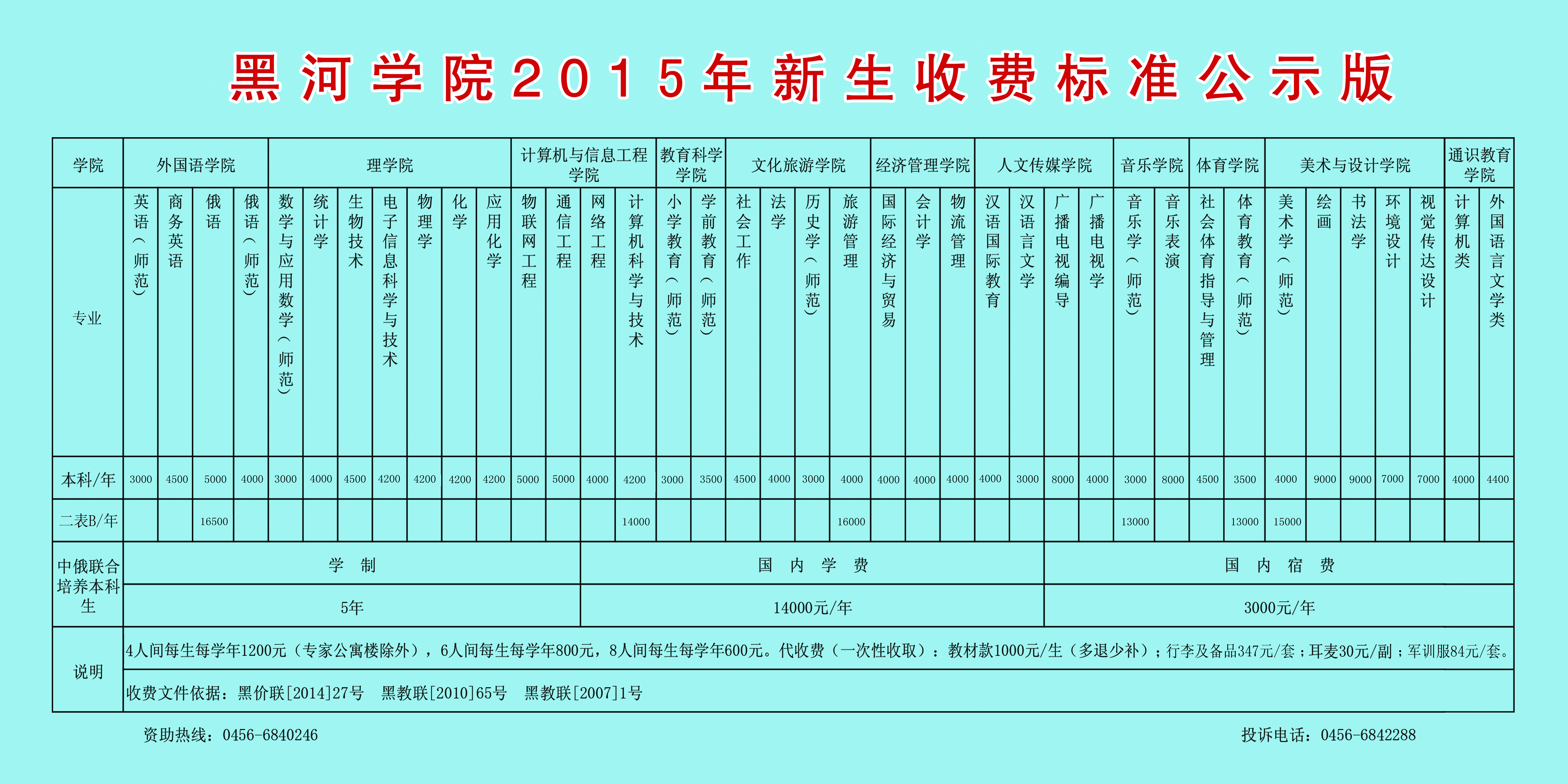 黑河学院2015年新生收费标准公示